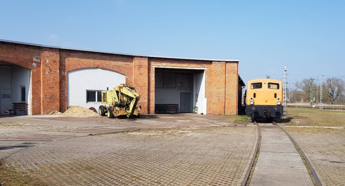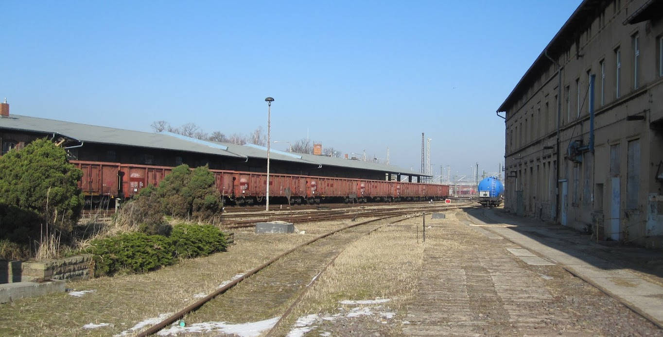 View of the former Magdeburg side of the station. This is where the trains went to and from the south until 1999. Today, our driver's cab rides take place here. A track-laying machine is also on display. The wasteland next to it has recently been revitalised by a road and a shopping centre.