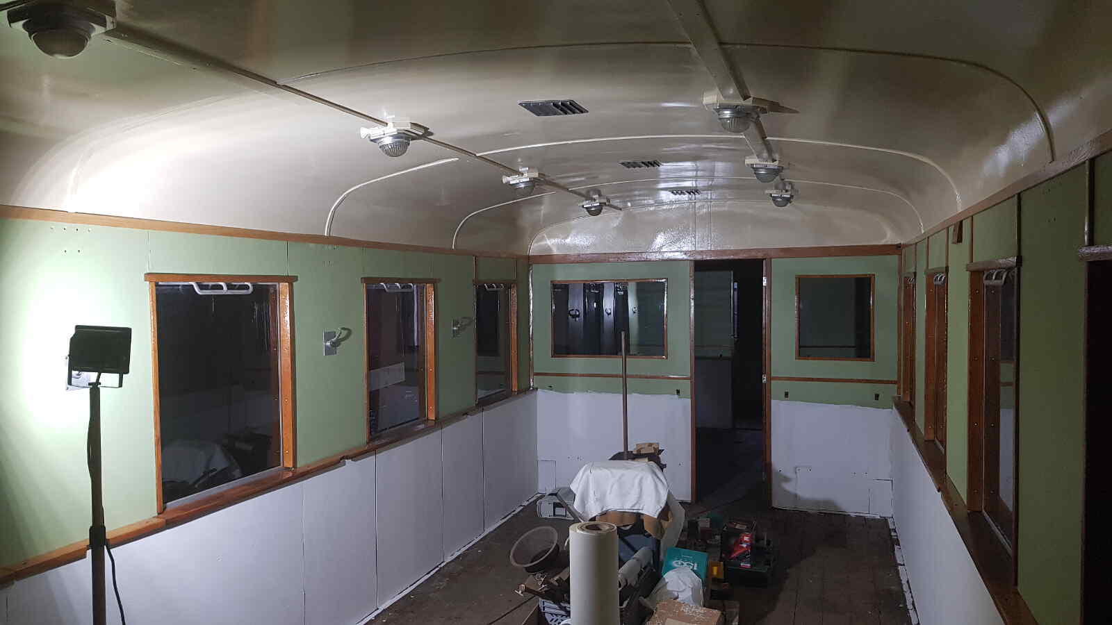 The interior work on our carriage 197 805 is also slowly progressing. The ceiling lighting, wall panelling and decorative mouldings, as well as the window frames, have been installed and painted. The upper half of the passenger compartments already looks like new again.