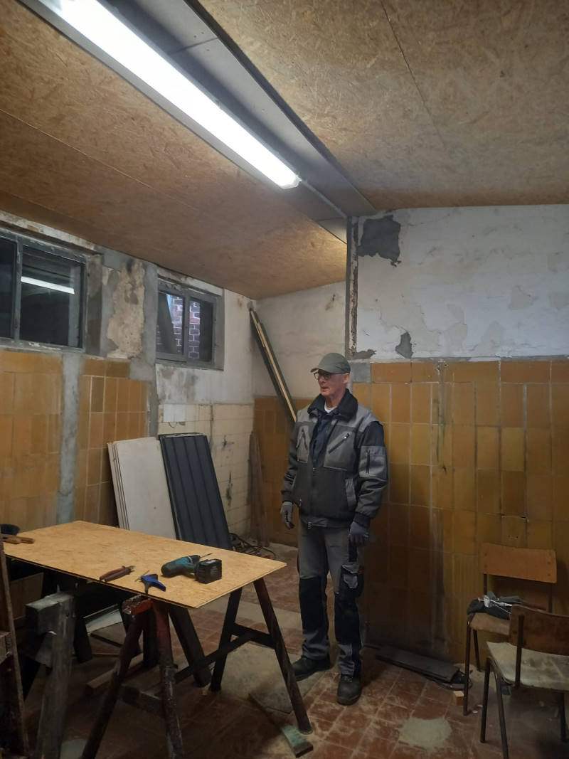Progress is also being made in the room that will house our small parts store in the future. Here, the ceiling has been covered and electric lighting installed.