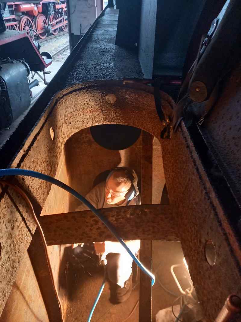 In addition, some rust and lime deposits were removed from the tender's water tank. This was done with a compressed air needle, which makes a hell of a noise. It is definitely advisable to wear hearing protection during the work.