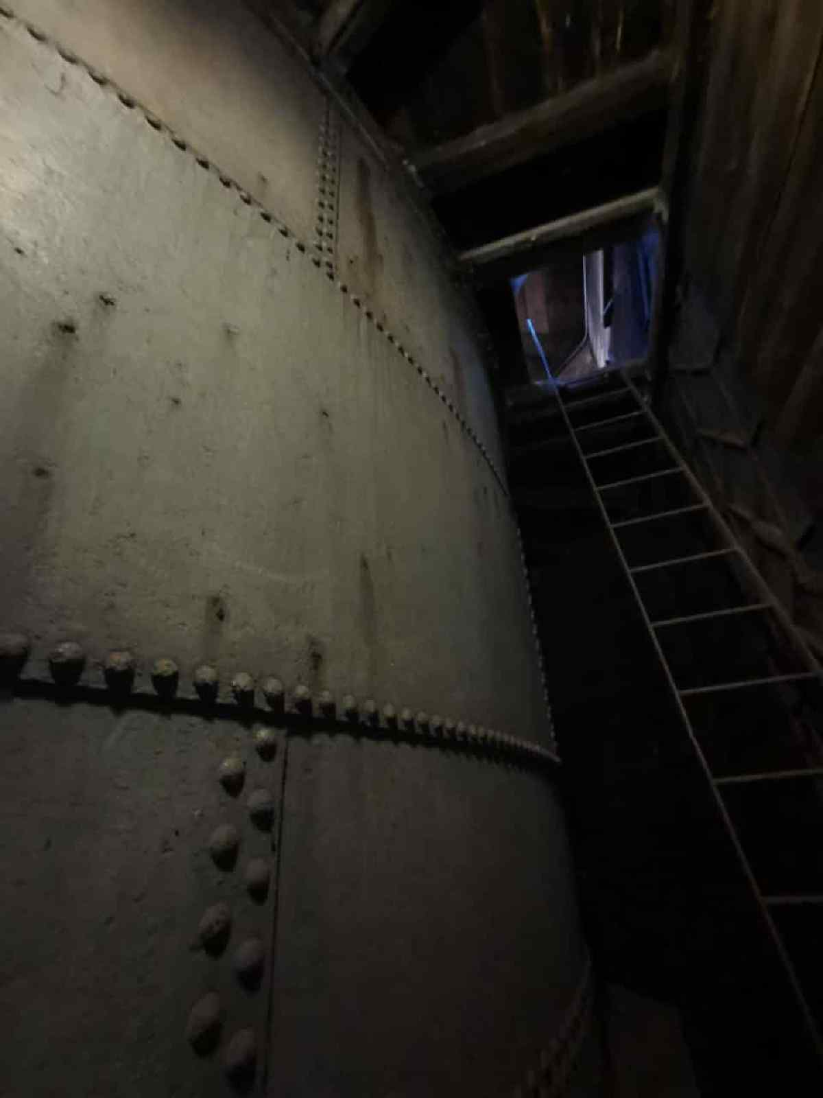 Oberhalb der Zwischendecke erreicht man den Vorratsbehälter. Eine weitere Treppe führt nach oben zum oberen Rand des Behälters