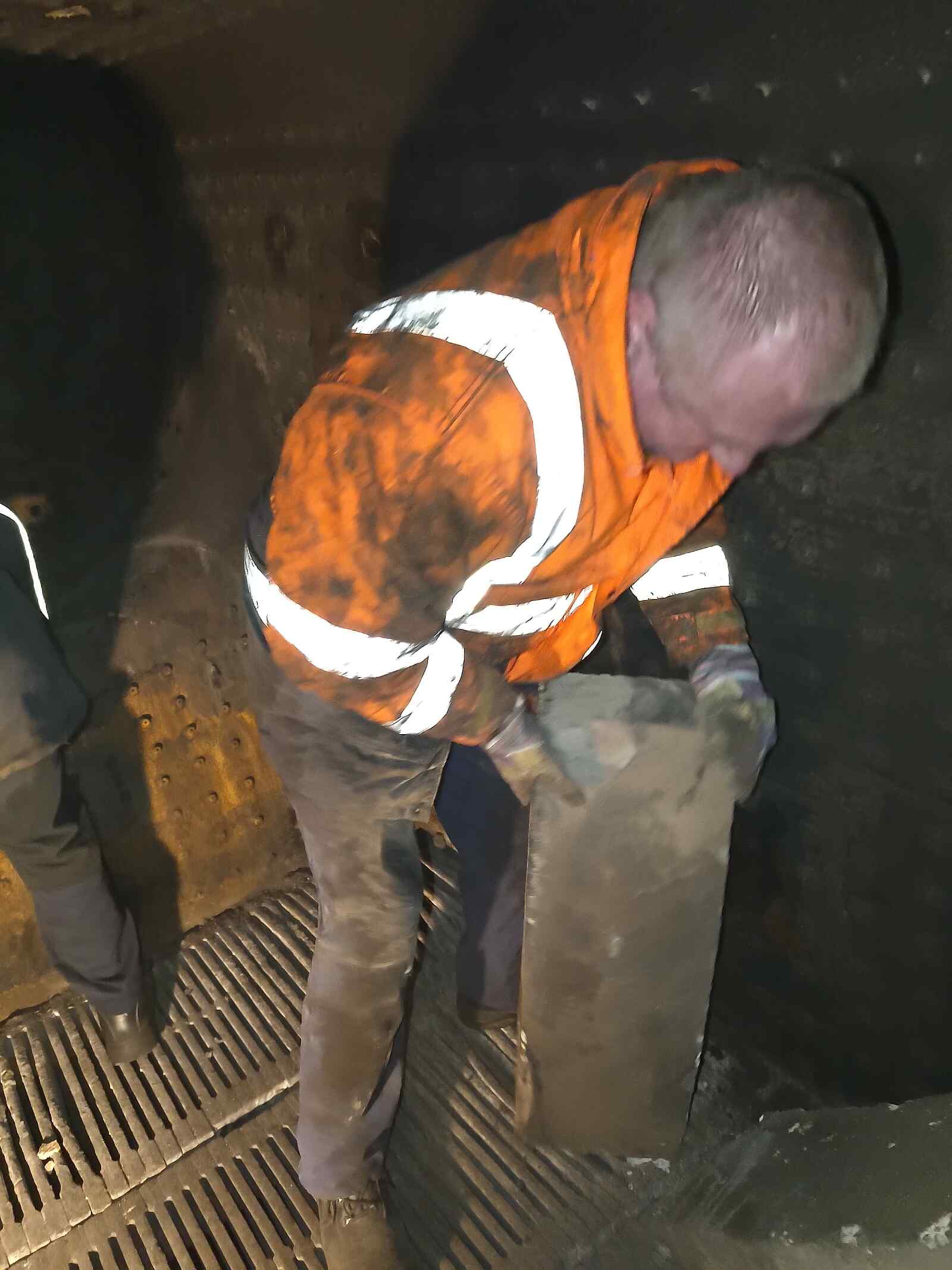 Once the superheaters had all been removed, the work shifted to the firebox. Here, the so-called brick arch (no. 20) had to be dismantled. This is a round arch made of fireclay bricks, which is intended to prevent the flames in the firebox from hitting the pipe wall located there directly. To do this, you have to climb into the firebox through the fire door (No. 19) on the driver's cab of the locomotive, which is only possible if your waist and shoulder width do not exceed a certain size.