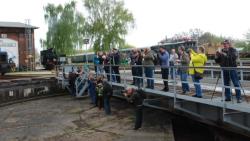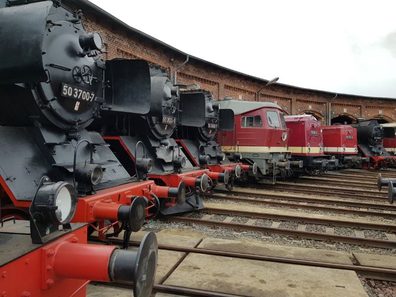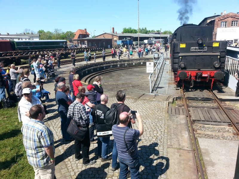 Auf die Drehscheibe vor dem Lokschuppen haben Vereinsmitglieder mittlerweile eine Diesellok 118 692 - 3 gefahren. Kameras fangen an zu klicken. Es ist quasi ein Vorspiel für die abendliche Fotoschau mit extra dafür arrangierten Museumsfahrzeugen.
